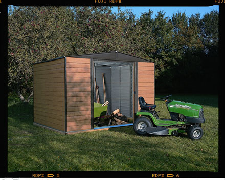 מחסן דמוי עץ ממתכת רוחב 313 ס"ס / 181 מחסן צבוע בתנור תוצרת אמריקה עומד בתנאי מזג האויר המחסן ניתן להרכבה עצמית.