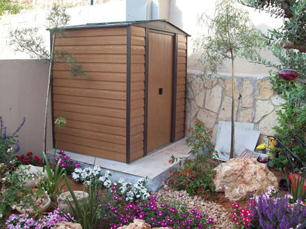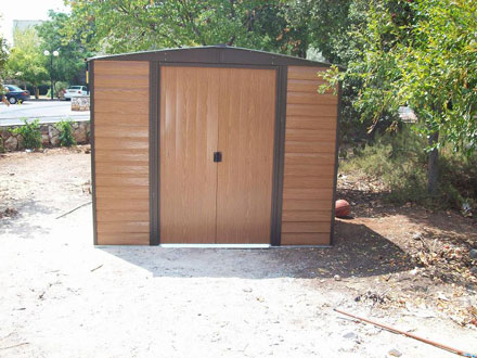 מחסן דמוי עץ ממתכת רוחב 181 ס"מ / 253. מחסן צבוע בתנור תוצרת אמריקה עומד בתנאי מזג האויר המחסן ניתן להרכבה עצמית.